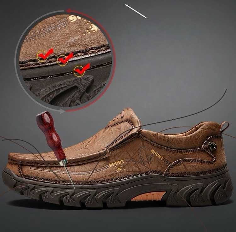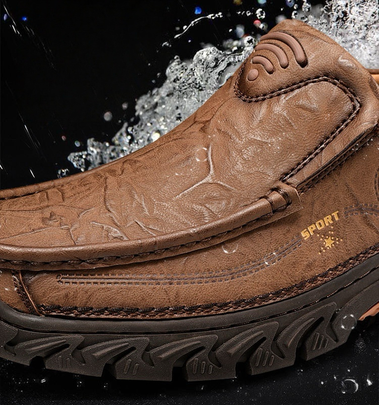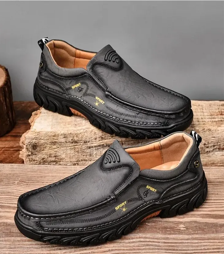 Crafted with a cow leather upper and breathable perforated design, these slip-on shoes keep your feet cool and dry. The flexible elastic opening ensures an easy fit while providing a secure, comfortable feel. The durable rubber outsole offers excellent cushioning, absorbing shock with each step. Paired with breathable, shock-absorbing insoles, they provide all-day comfort and support, making them perfect for work, travel, or even as home slippers. Ideal for any occasion or terrain.